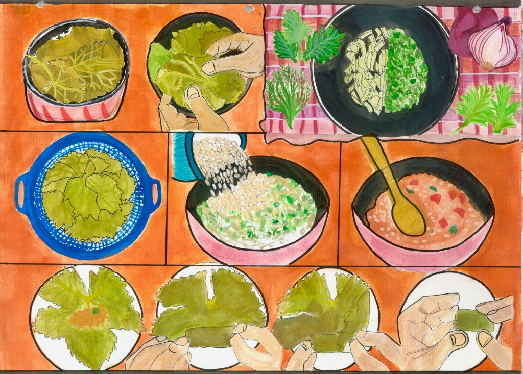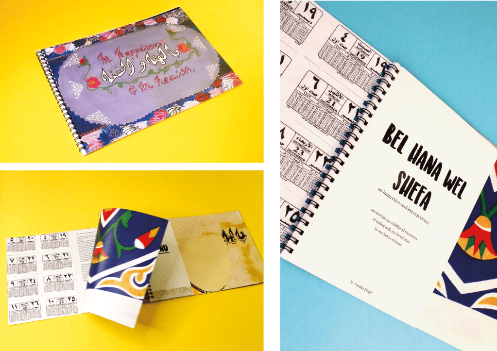 In one of my most personal projects, Bel Hana Wel Shefa, I illustrated family recipes in the form of a cook book while also celebrating the material culture of Egyptian food through nostalgia & kitsch. The cookbook exists as a collection of my childhood memories, honoring the people that have impacted my life. Feeding each other is the way my family, and many Arabs, express their love. Remaking a dish not only reminds me of those moments but also presents itself as a form of preserving our heritage. The anxiety here is not losing the actual recipes, but losing a part of you, and essentially your identity. Through collaging objects, colours, and textures, I try to evoke certain sentiments surrounding family traditions and nostalgia. I also added QR codes to access interviews and conversations surrounding those dishes, as well as nostalgic tunes such as Abla Fadeela’s intro “Ya Welad Ya Welad.”