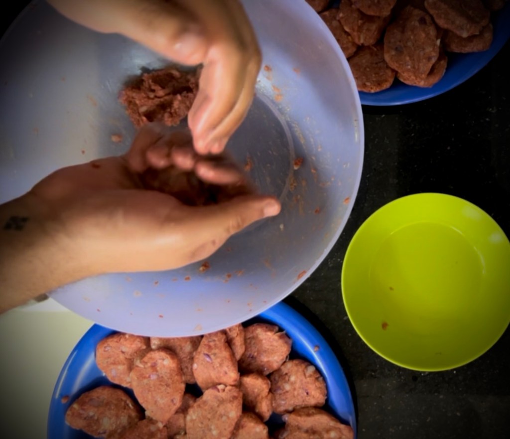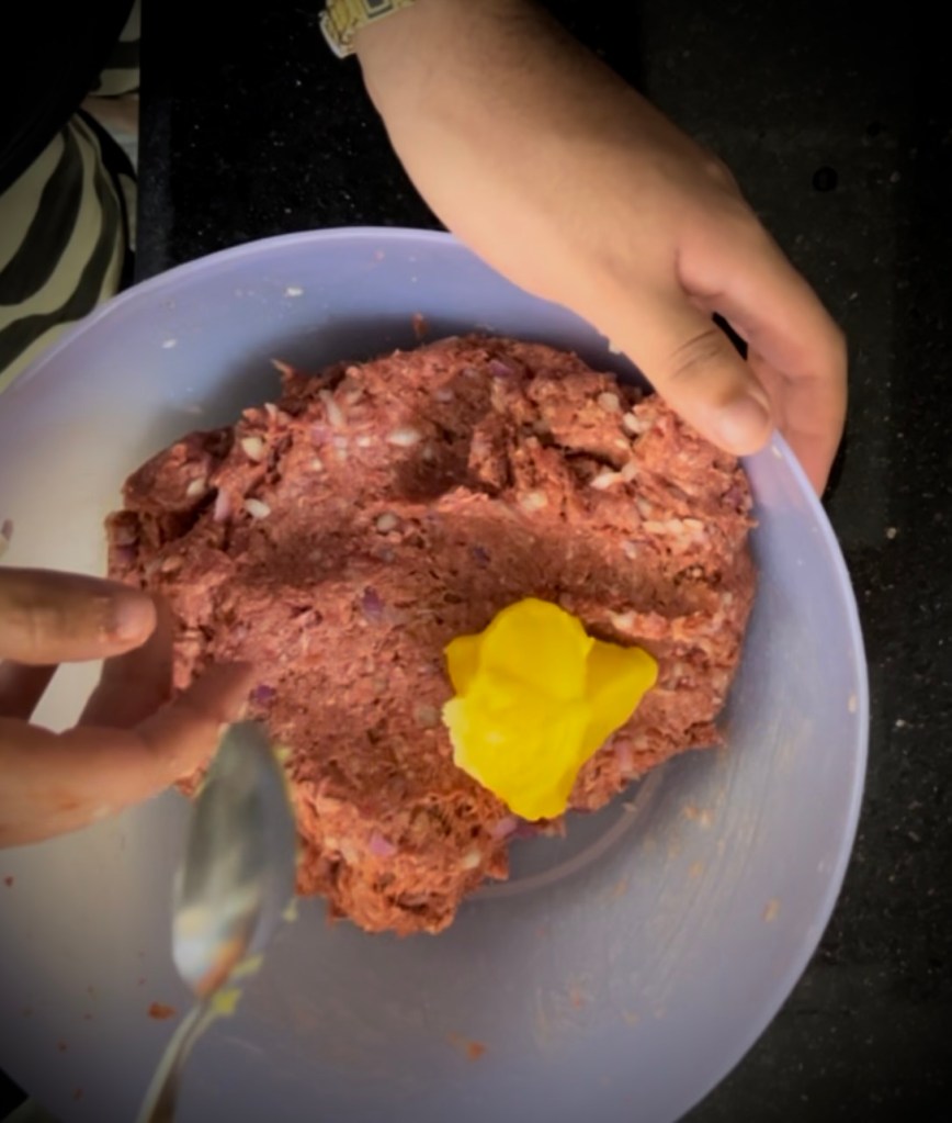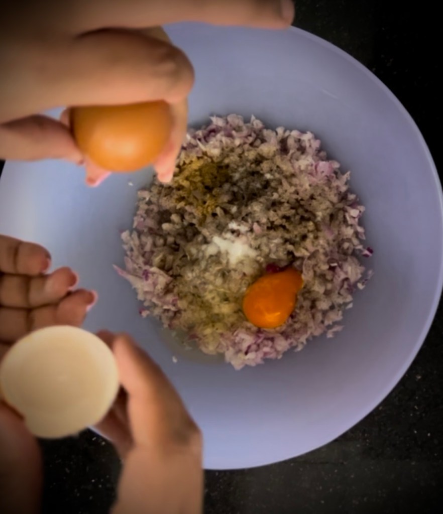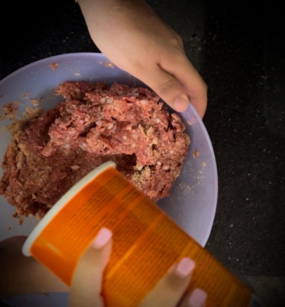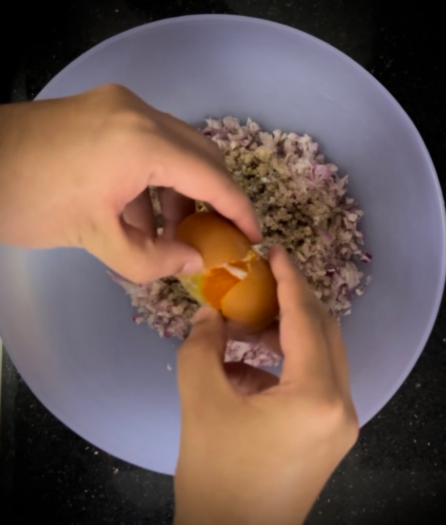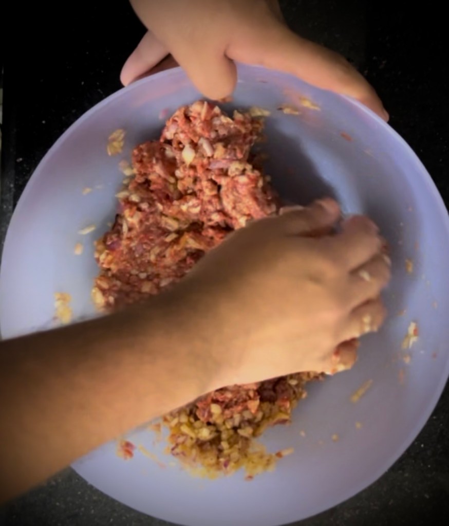 Any kind of meat will do. My mother’s preferences are New Zealand and Australian, for reasons unbeknownst to me. I prefer Brazilian. In a bowl, add the minced meat with a diced onion and mix.