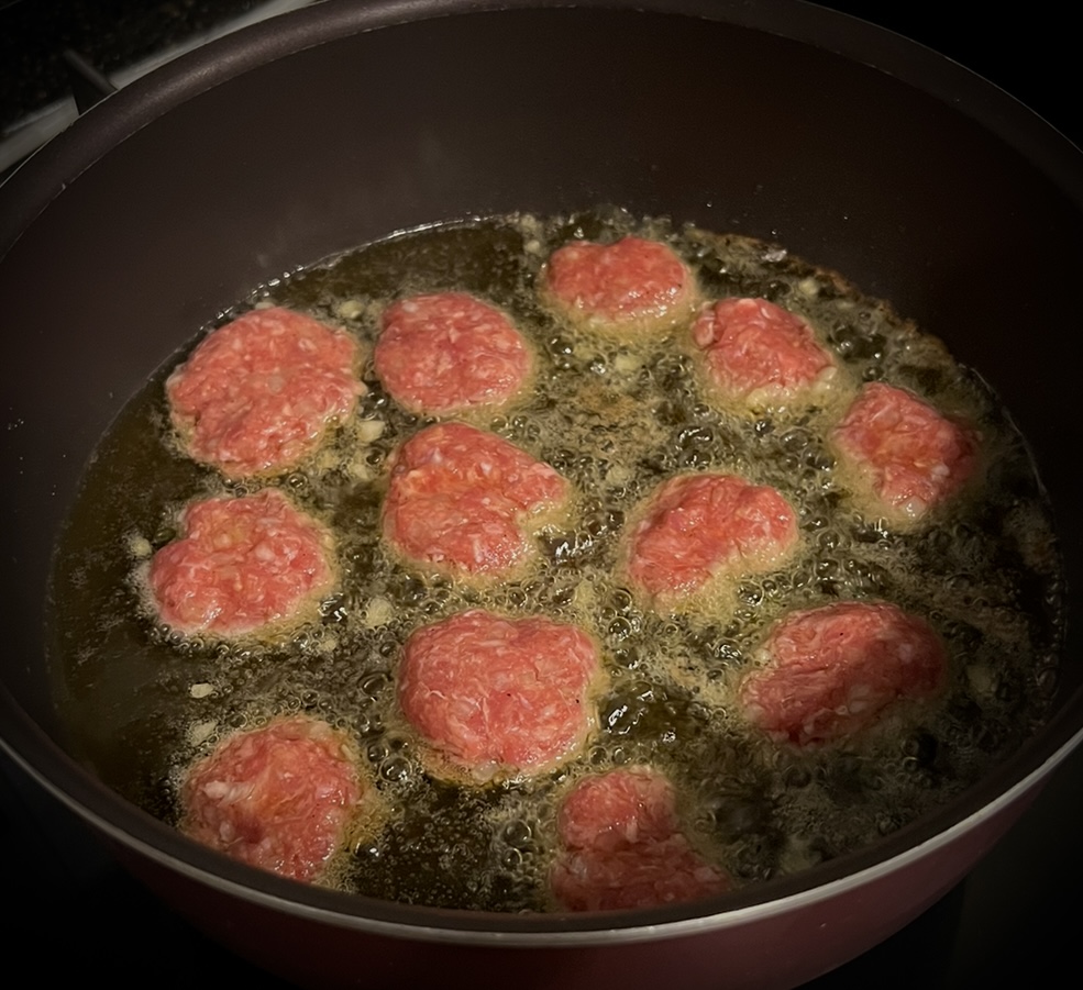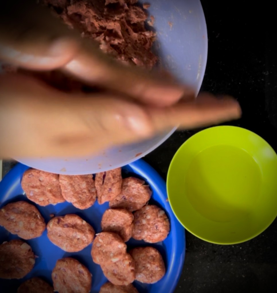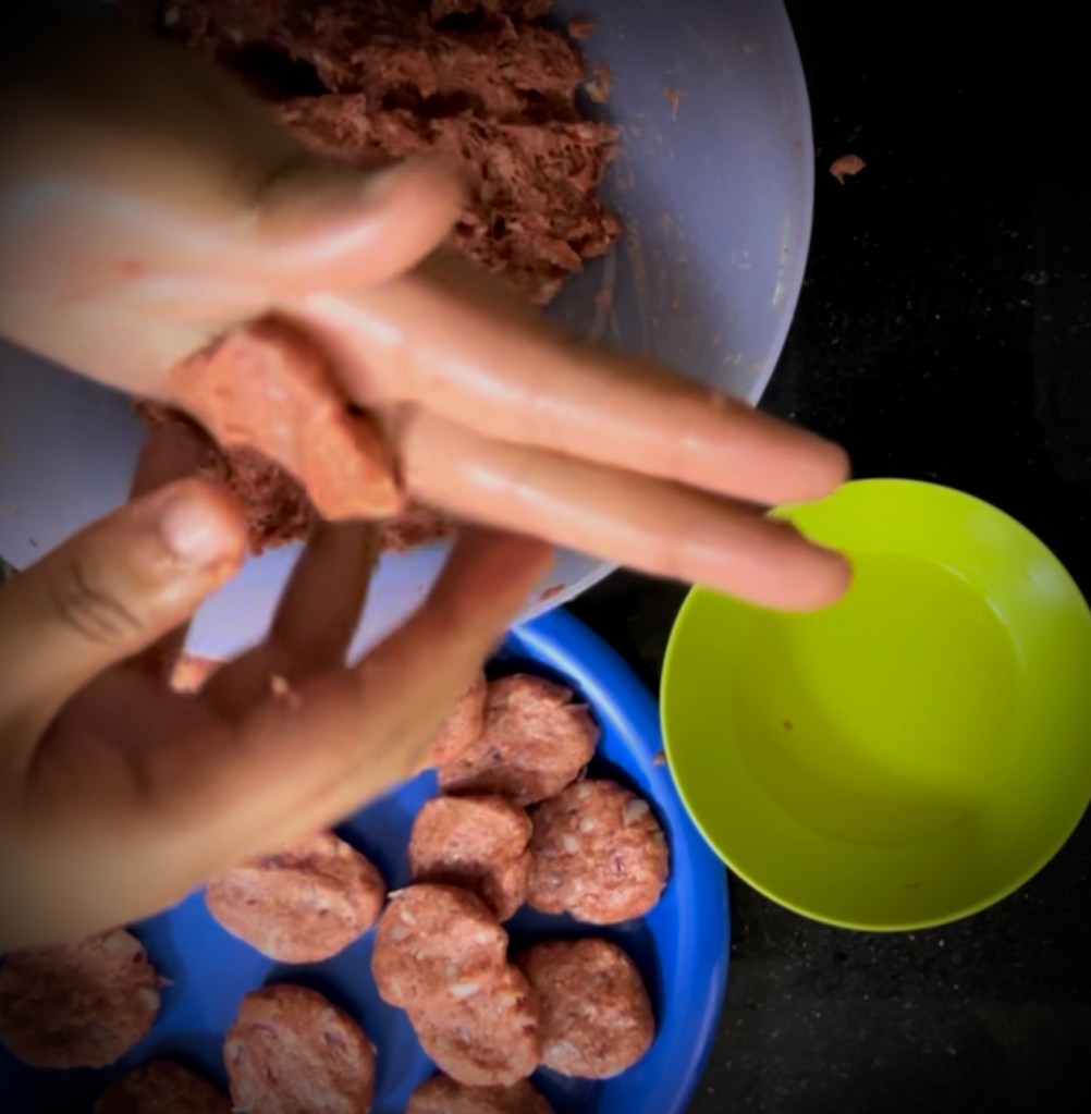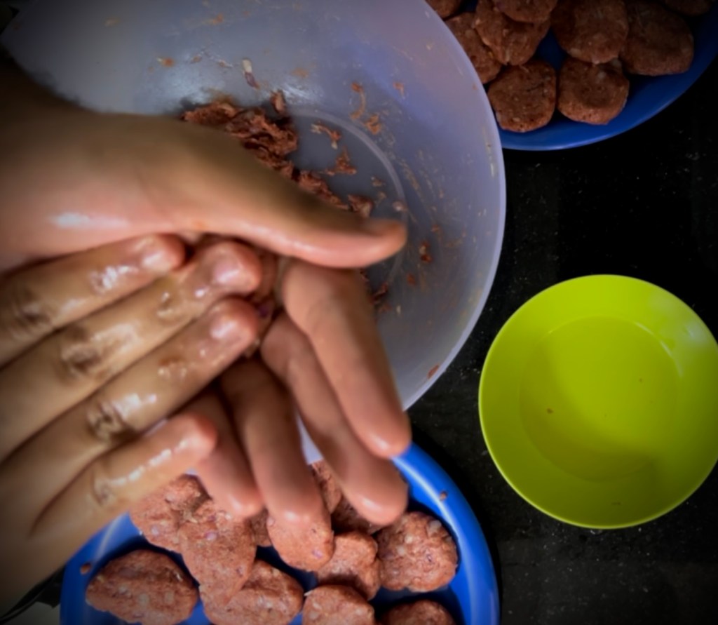 Be generous with this. Ghee is a staple in Egyptian cooking and cuisine. I’ve used ghee when cooking savory dishes and desserts. I’ve used it as an additive to oil when frying. I’ve even used it instead of butter or oil to make eggs. Here, there really is very little attempt in striving to be the healthiest or most conscientious. Ghee just makes everything taste that much better. Once you’ve added a tablespoon, knead the meat again. Only this time, more firmly as though something unwritten is beginning to take shape. Once this is done, the meat is fully prepped and ready to be pieced and unpieced to make Kofta. If the meat batter is a bit too warm or not holding itself tight enough, refrigerate it for twenty or thirty minutes. Once ready, prepare a small bowl filled with oil. Dab your fingers into the oil and take off a piece of meat as we do when we slice lands, creating borders, round it up into a ball, then roll it sideways with the palms of your hand, and finally flatten it with your three middle fingers. This shaping process is critical for me, because the Kofta once fried will look more similar to a stretched meatball than it will an actual Kofta. This is the way my mother was taught by her mother and the way I was taught by my mother. For me, Teta exists somewhere between the making of and then again in the shape of this Kofta.